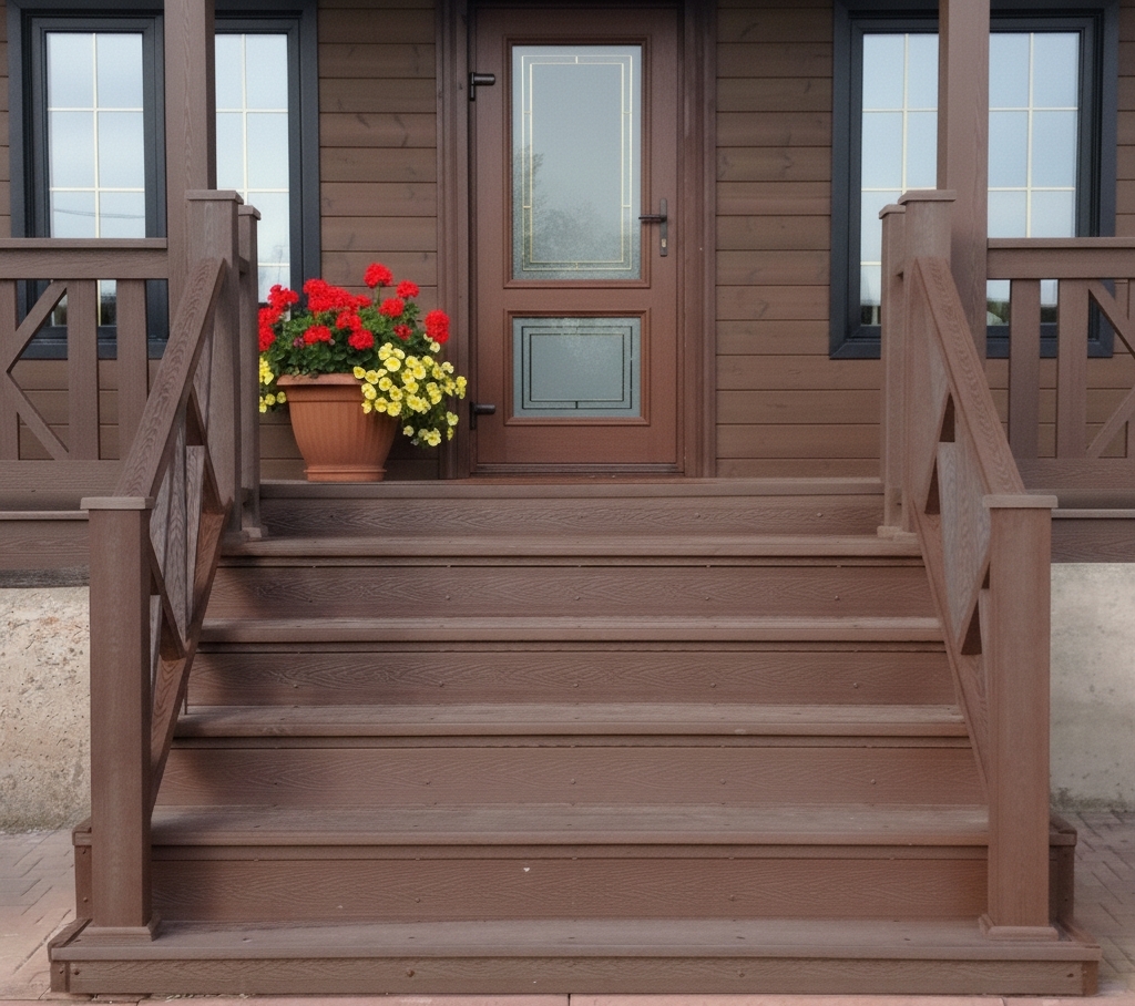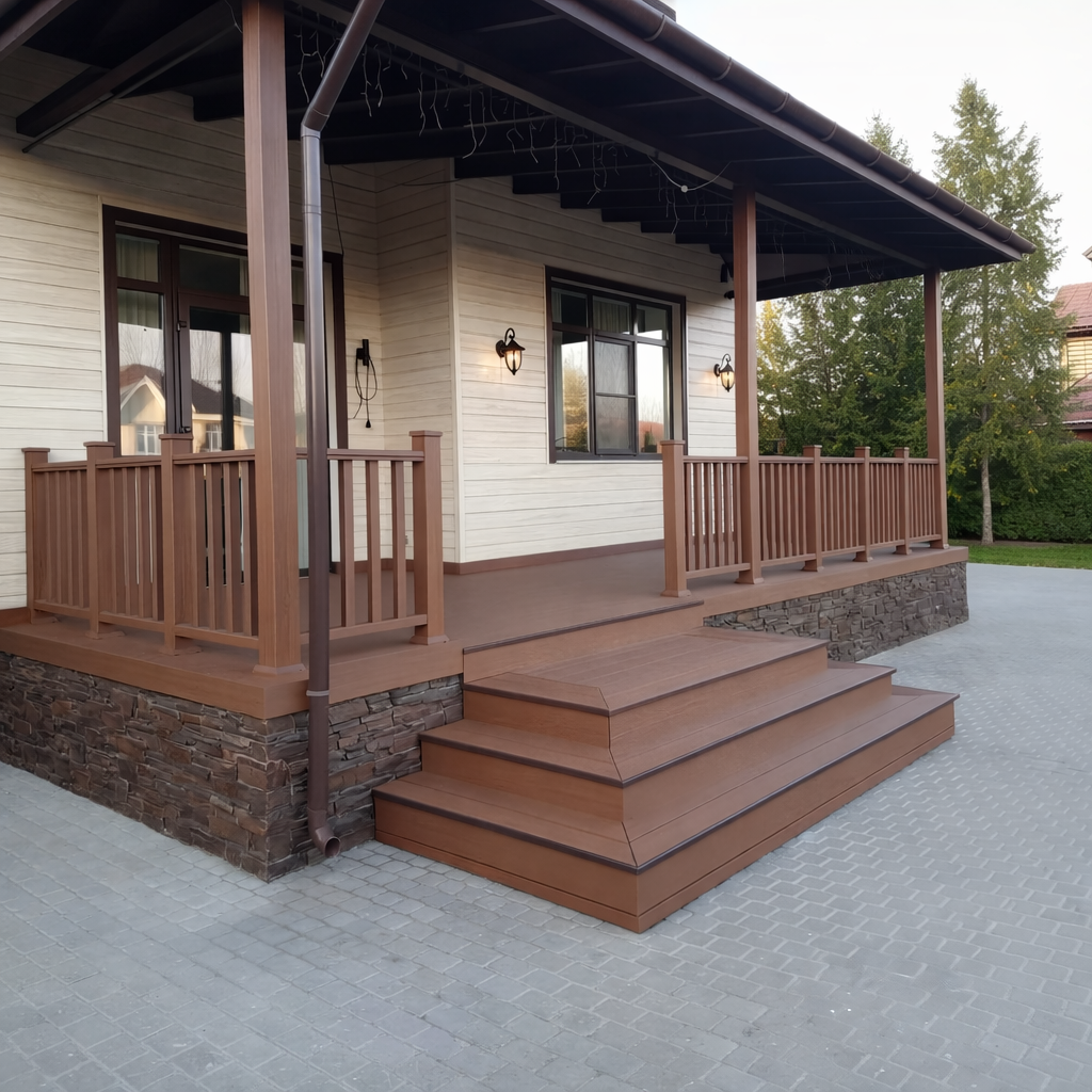Ступени и площадка крыльца — самая нагруженная зона. Обычный материал может не справиться. Но ДПК с повышенной износостойкостью — это иной класс надёжности. Он не стирается, не скользит и выглядит как новый, бросая вызов и времени, и непогоде.