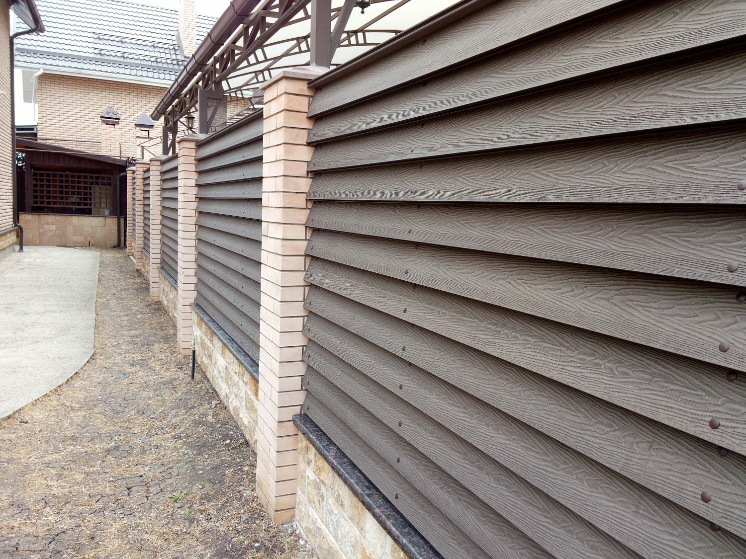 Крепкая классика. Сплошное ограждение из ДПК, которое выглядит как дорогая деревянная доска, но лишено ее недостатков. Ни трещин, ни выцветания, никакой ежегодной обработки антисептиком. Просто установил и забыл на 25 лет. Ваша главная экономия - это время и нервы на обслуживании.