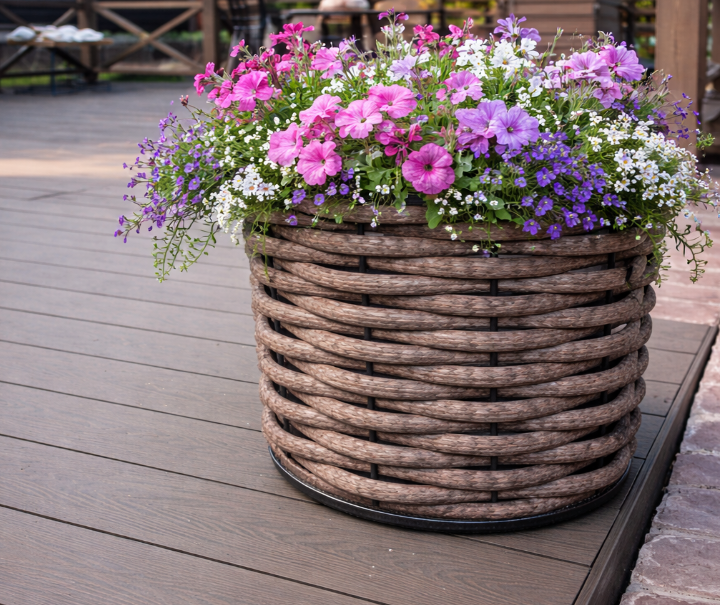 Кашпо из полимерной лозы в сочетании с террасой из ДПК дарят вашему ландшафту гармонию и единый стиль.