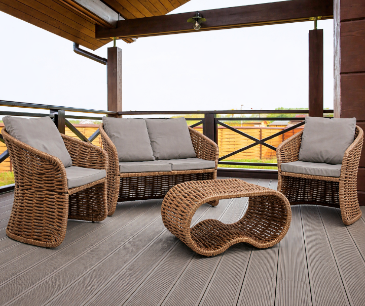 Комплексное решение: терраса из ДПК плюс мебель из полимерной лозы. Пол и обстановка выдержаны в едином стиле, цвета идеально сочетаются между собой.
