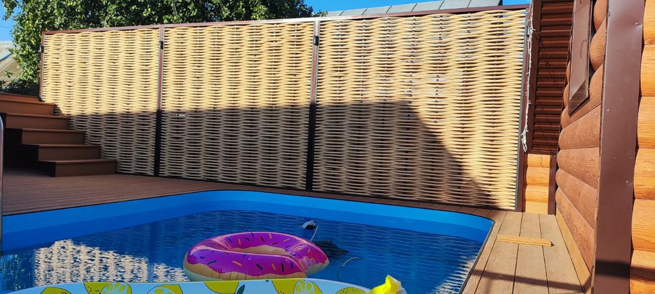 Вот реальный пример того, как WhiteDeck преображает участки. Один объект объединил три наших решения: забор из лозы, ступени из ДПК и террасную доску вокруг бассейна. Результат радует — стильно, надёжно и без лишних забот.